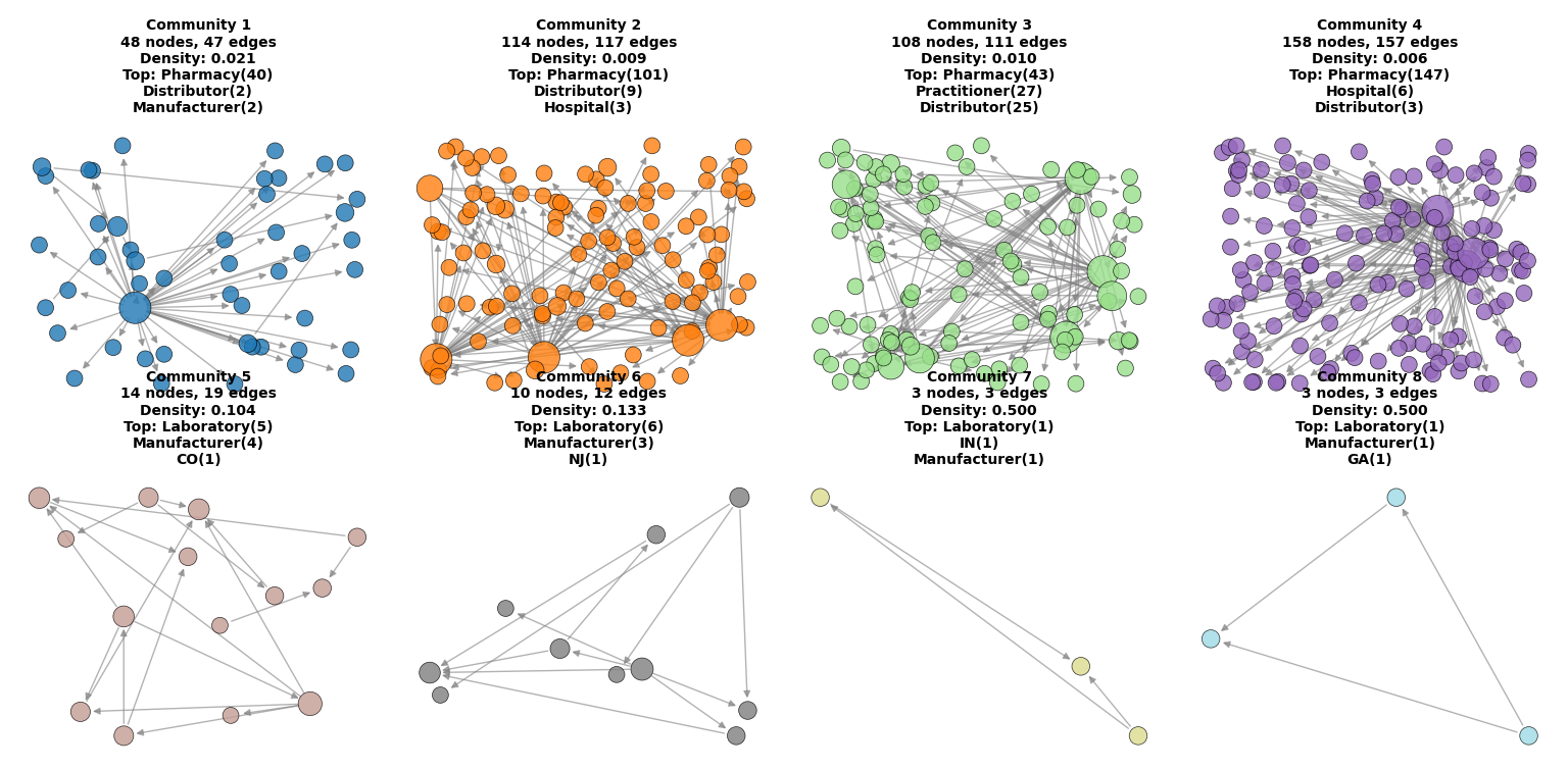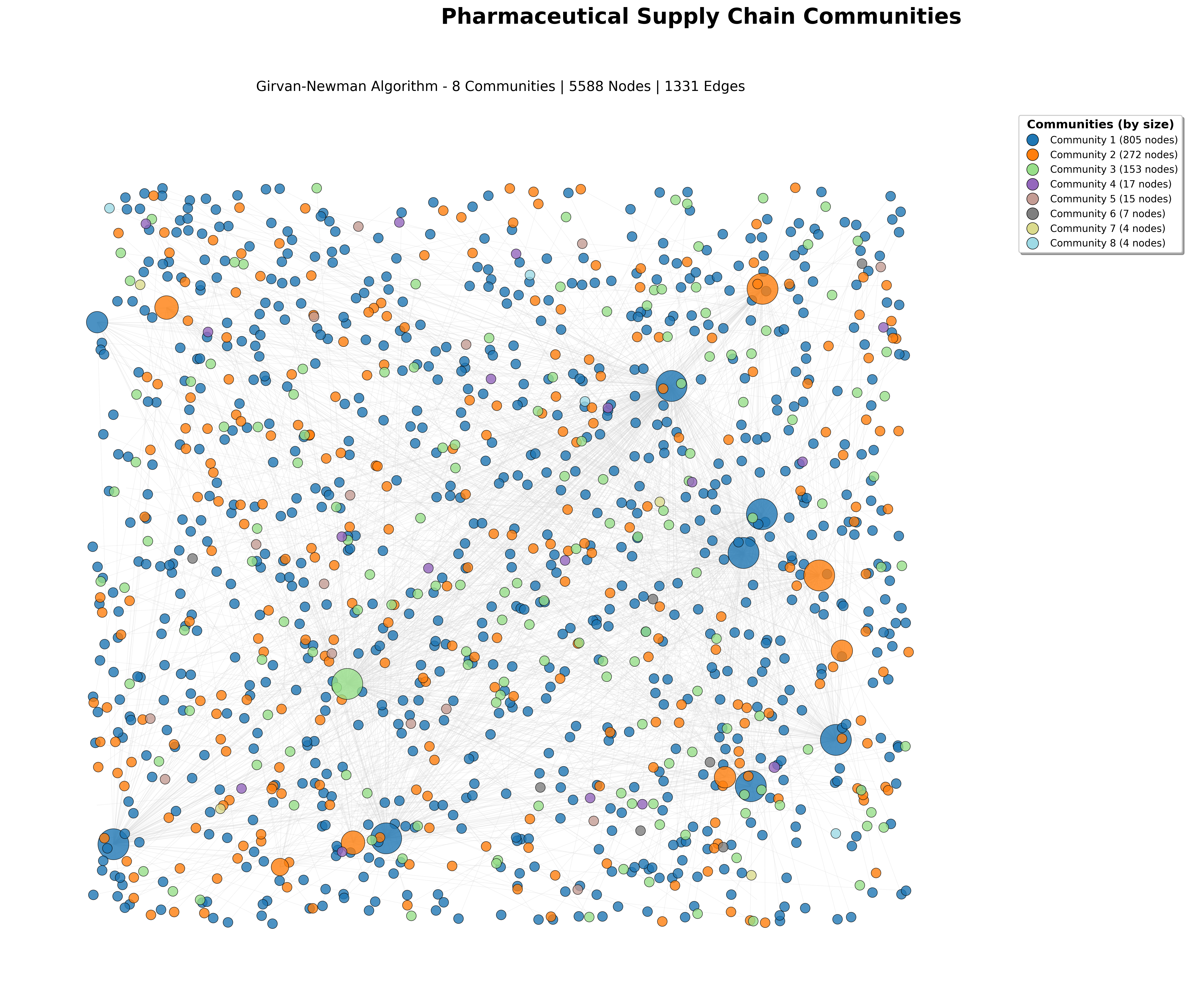 Visualization of the 8 largest communities detected by the Girvan–Newman algorithm. Large diffuse clusters represent broad distribution networks, while smaller dense clusters illustrate specialized functional groups.